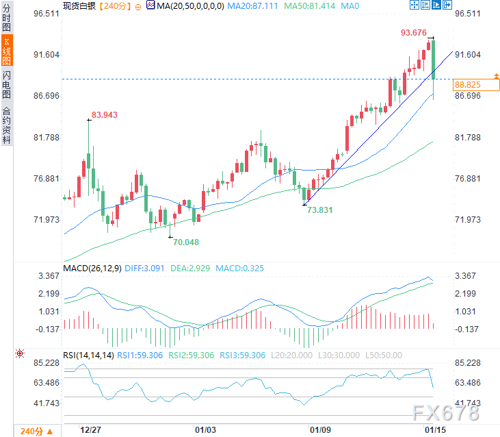这种不确定性已波及大宗商品市场,随着地缘政治风险溢价部分消失,白银价格大幅下跌。周四(1月15日)亚市时段,现货白银一度触及每盎司93.68美元的历史新高,随后震荡下跌,一度下跌逾7%至86.29美元/盎司,现交投于88.70美元附近,跌幅约4.88%。