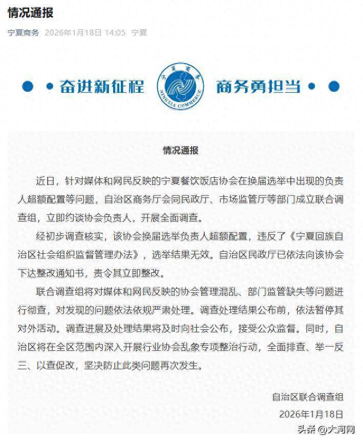 近日,针对媒体和网民反映的宁夏餐饮饭店协会在换届选举中出现的负责人超额配置等问题,自治区商务厅会同民政厅、市场监管厅等部门成立联合调查组,立即约谈协会负责人,开展全面调查。